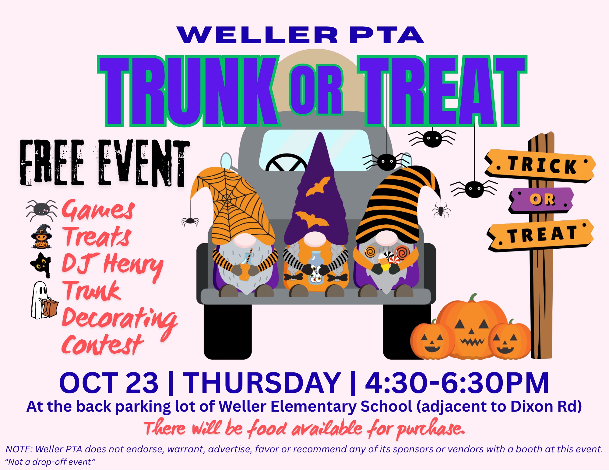 We're excited to see you all this Thursday at our annual Weller PTA Trunk or Treat event! We're still looking for candy donations, so please drop a bag off at the office if you can!