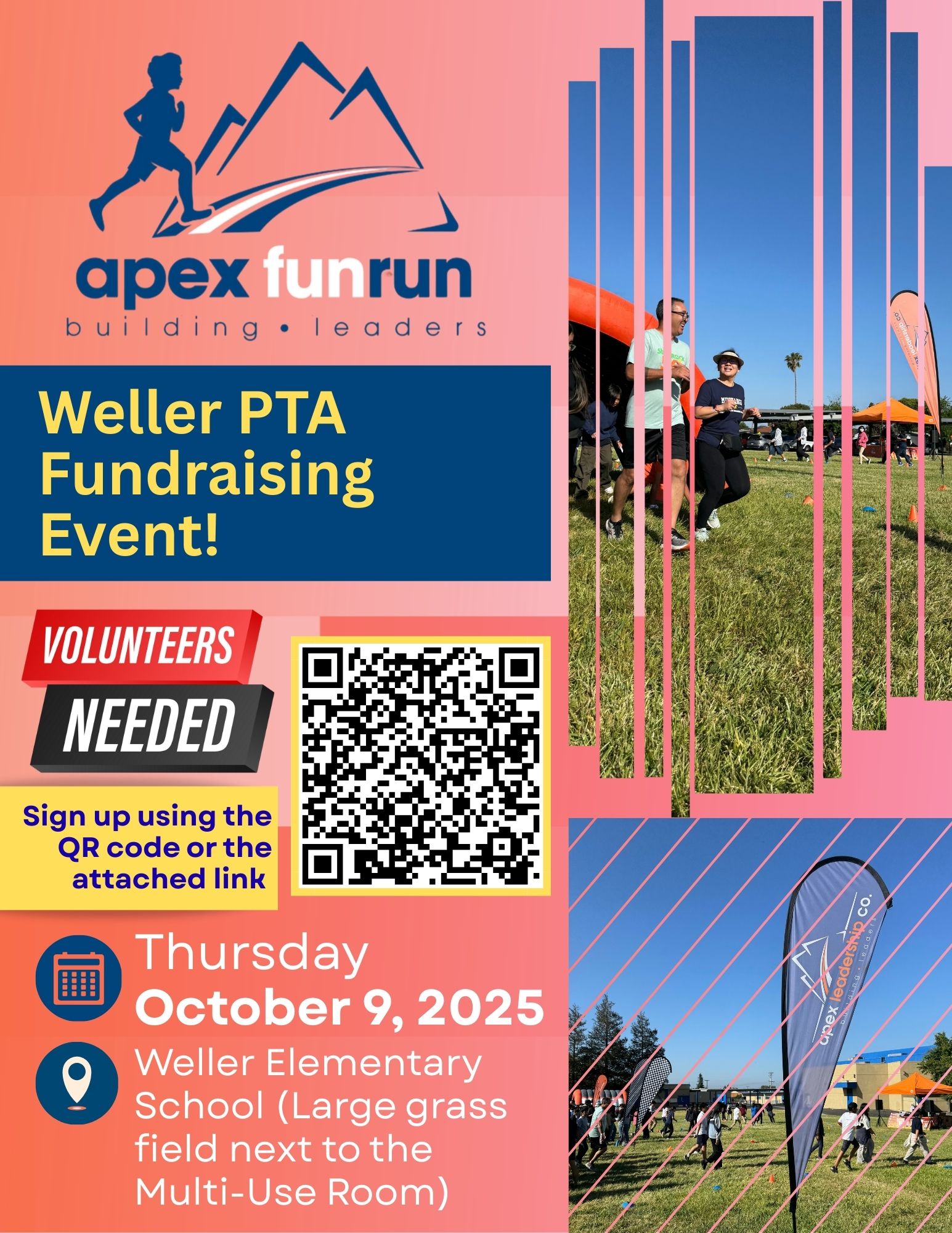 Weller and PTA will be working with APEX again this year to raise money for our students and school. We are in need of volunteers for our Fun Run on October 9th. Please connect with your classroom teacher or our PTA if you are able to volunteer and help out during our Fun Run. It is a great time and a fantastic community event!