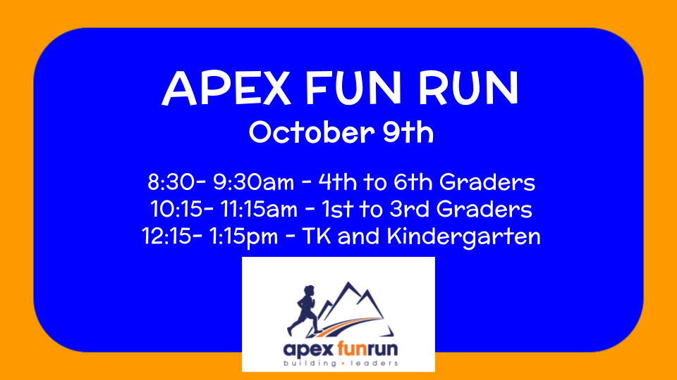 Apex Fun Run! For the next two weeks, we have a team of Apex athletes on our campus teaching us about fitness and leadership as we raise pledges for our Fun Run. Please help us raise donations from family and friends.